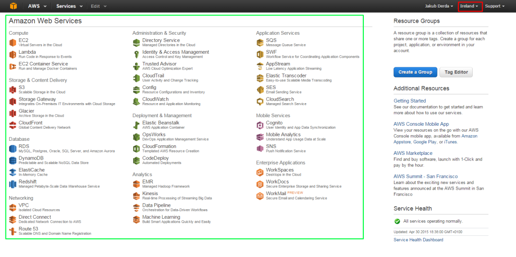 Na ekranie tym mamy główne okno — w tym miejscu będą widoczne opcje zarządzania wybraną usługą. Na ekranie głównym widzimy listę usług i ich krótki opis. W górnym rogu mamy do wyboru lokalizację. Ponieważ Amazon dysponuje serwerowniami na całym świecie, możemy sami decydować, w którym miejscu świata będzie uruchamiana nasza aplikacja. Ogólna zasada jest taka, że im bliżej potencjalnych użytkowników tym lepiej. Obecnie lokalizacją najbliższą Polsce jest Frankfurt.