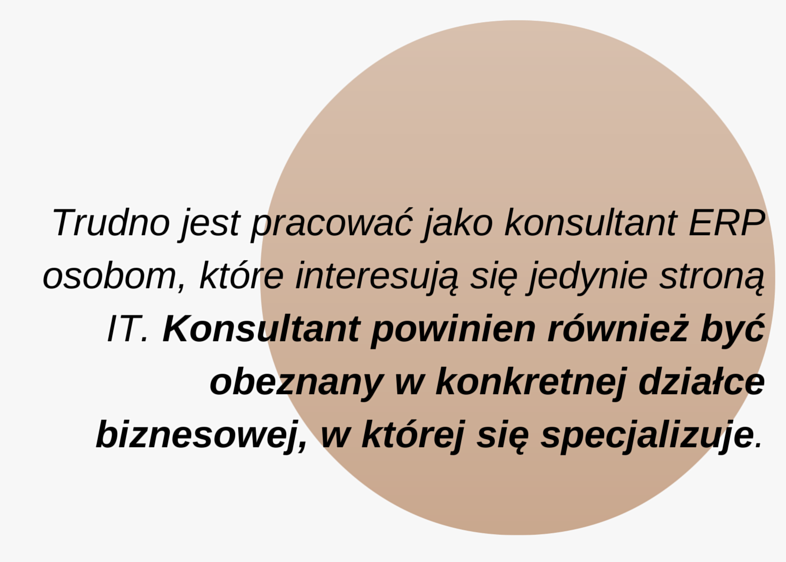 Rola konsultanta ERP jest bardzo szeroka i trudno określić jedną kwestie, którą konsultant się zajmuje. Jeżeli mam jednak podjąć się próby zgeneralizowania, to określiłbym to mianem ‘wsparcia klienta w zakresie funkcjonowania systemu ERP’. Systemy klasy ERP to kompleksowe, zintegrowane oraz często skomplikowane w użyciu systemy informatyczne, których rolą jest zarządzanie przedsiębiorstwem w ujęciu całościowym. Oznacza to, że wszystkie (lub większość) działy firmy, takie jak: handel, księgowość, produkcja itp. ewidencjonowana jest w ramach jednego systemu informatycznego.