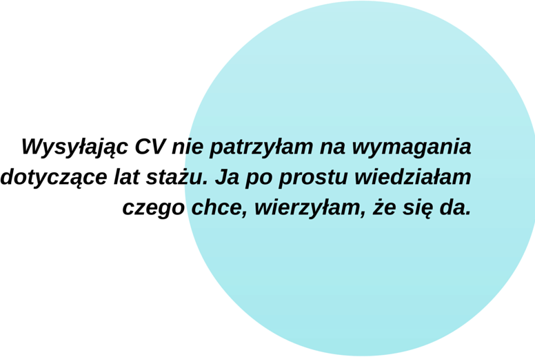 Jakże mogłabym powiedzieć nie. Oczywiście zgodziłam się, tym bardziej że już byłam w Warszawie, więc nie musiałabym przyjeżdzać po raz drugi. Po 15 minutach już odbywałam rozmowę z menagerem, a zarazem swoim docelowym przełożonym. Nie pamiętam już dokładnie o co pytał, ale pamiętam, że powiedziałam wprost „Wiem, że nie posiadam doświadczenia, ale proszę dać mi szansę. Jestem bardzo zdeterminowana. Obiecuję, że Pan się nie zawiedzie.” Wtedy padło pytanie: „To od kiedy Pani może zacząć?” Po tym pytaniu pojawił się uśmiech na mojej twarzy. Wraz w początkiem października rozpoczełam pracę w dużej firmie, zmieniłam miejsce zamieszkania z Wrocławia na Warszawę i tak zaczęłam swoją przygodę z IT.